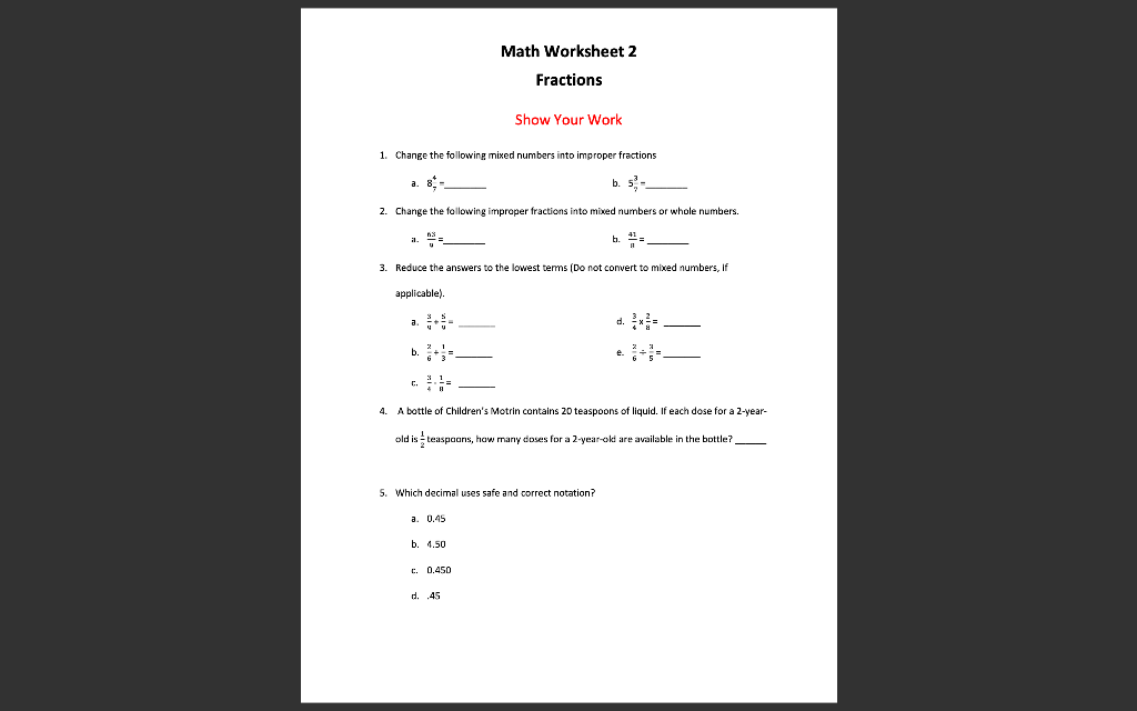 Fractions to Decimals Worksheets | K5 Learning Explore all of our fractions worksheets, from dividing shapes into "equal parts" to multiplying and dividing improper fractions and mixed numbers. What is K5? K5 Learning offers free worksheets , flashcards and inexpensive workbooks for kids in kindergarten to grade 5. Free Fraction Worksheets and Printables - ThoughtCo Feb 19, 2020 · There are over 100 free fraction worksheets in PDFs below to support the many concepts encountered with fractions. When starting with fractions, begin by focusing on 1/2 and then a 1/4 before moving to equivalent fractions and using the 4 operations with fractions (adding, subtracting, multiplying and dividing)