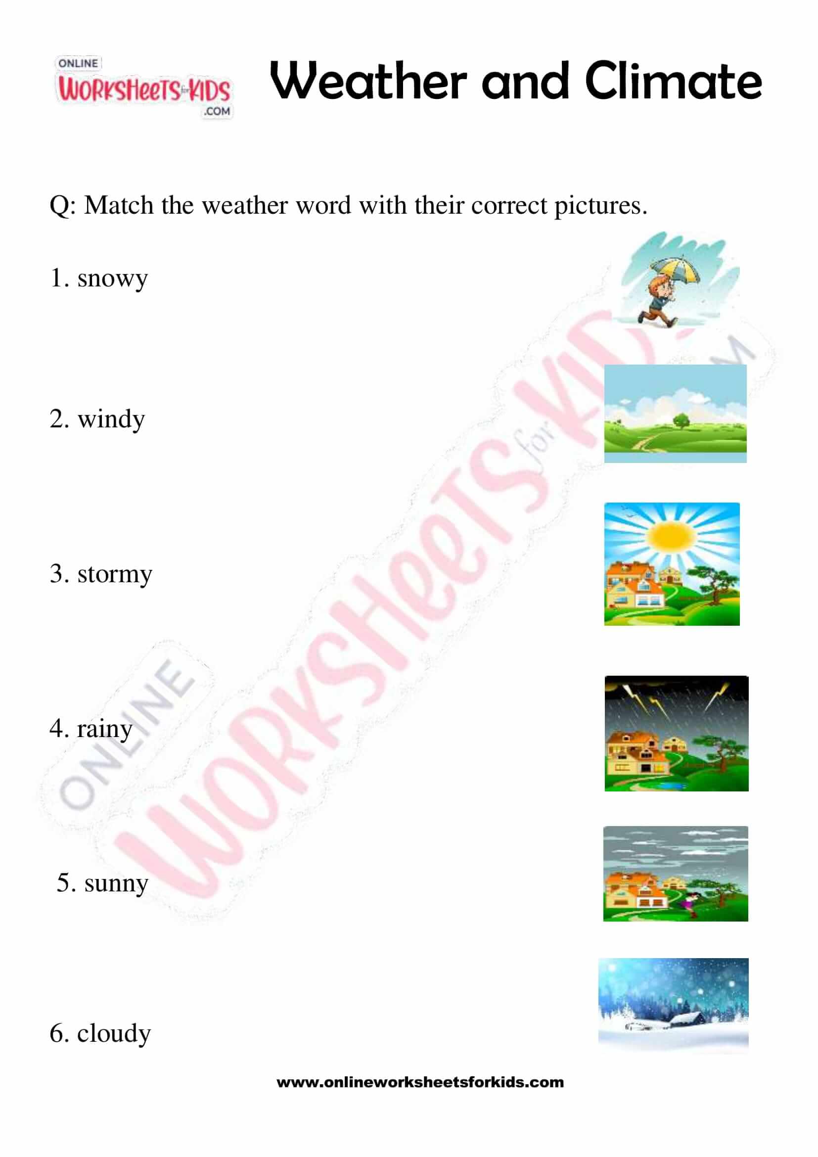 Weather Worksheets Go word hunting and circle the weather words in this printable worksheet for grade 1 and grade 2. Word search helps kids develop patterns to recognize the word as a whole and reinforces spellings as well. Match the weather to the accessories Weather often determines our choice of clothes and accessories.